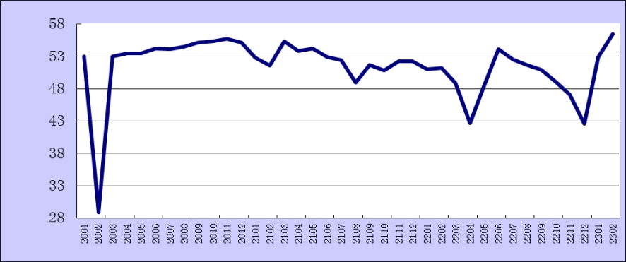 中國物流與采購聯合會、國家統計局服務業調查中心采購經理調查發布的2023年2月份綜合PMI產出指數為56.4%,較上月上升3.5個百分點。該指數是PMI指標體系中反映當期全行業(制造業和非制造業)產出變化情況的綜合指數,由制造業生產指數與非制造業商務活動指數加權求和而成,權數分別為制造業和非制造業占GDP的比重。
