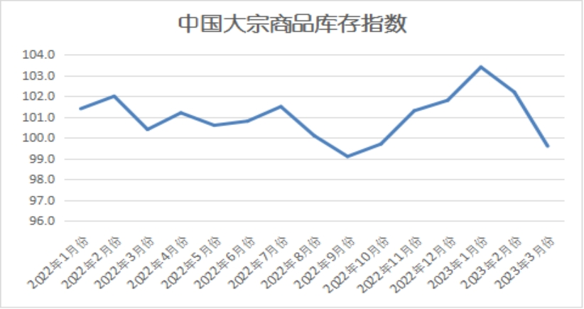 2023年3月份,大宗商品庫存指數兩連跌至99.6%,指數跌至近五個月以來的最低點,顯示前期持續處于積壓態勢的商品庫存開始減少,國內大宗商品庫存壓力有所緩解。各主要商品中,鋼鐵、鐵礦石和成品油因供需狀況明顯好轉,由升轉降,有色金屬和化工庫存量雖有增加,但增速減緩,煤炭和汽車庫存量受需求下降的影響,增速加快。