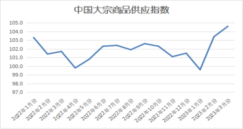 2023年3月份,大宗商品供應指數兩連升至2020年8月份以來的最高點,為104.6%,較上月上升1.2個百分點,顯示隨著國內經濟和制造業的復蘇,市場需求持續回暖,生產企業對后市預期良好,生產熱情高漲,國內大宗商品市場供應量持續增加,增速有所加快。從各主要商品來看,本月各商品供應量繼續呈現全部上升的局面,且除成品油外,其余品種供應增速均有所加快。