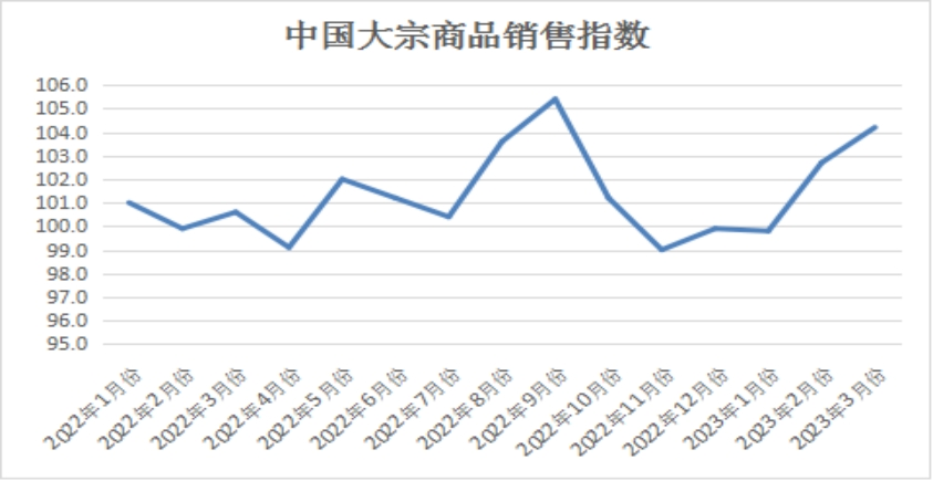 2023年3月份,大宗商品銷售指數較上月上升1.5個百分點,至104.2%,指數升至近六個月以來的最高點,顯示隨著傳統旺季的來臨,終端用戶備貨積極,市場銷售情況向好,企業訂單組織逐步順暢,本月國內大宗商品銷售量增速較上月有所加快。各主要商品中,本月除汽車外,其余各商品銷售量繼續呈現全部上升的局面,且除煤炭外,其余品種銷售增速均有所加快。