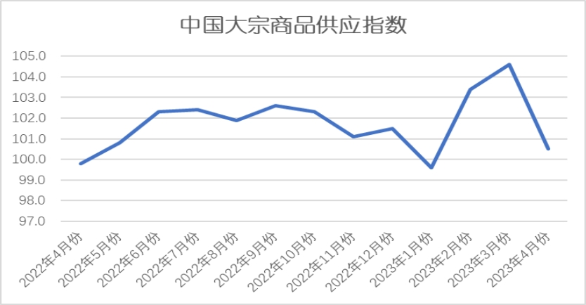 2023年4月份,大宗商品供應指數較上月回落4.1個百分點,至100.5%。從各主要商品情況來看,生產利潤仍是左右商品生產和供應的重要因素,與此同時,部分行業需求未如預期般恢復,企業生產雖有一定的積極性,但受制于利潤、原料、訂單等因素影響,部分商品生產企業逐漸下調生產計劃,本月商品整體產量有所減少,市場供應增速減緩。其中,鋼鐵和鐵礦石供應量受生產利潤和到港下降的影響,出現明顯的降幅,煤炭、有色金屬、化工和汽車供應量雖有增加,但增速有所減緩,成品油供應量受利潤推動以及基數較大的影響,本月供應量繼續增加,且增速略有加快。