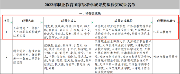 2023年5月15日,教育部對外發布了《2022年職業教育國家級教學成果獎擬授獎成果的公示名單》,名單顯示共評選出2022年職業教育國家級教學成果獎擬授獎成果572項,其中,特等獎2項、一等獎70項、二等獎500項。其中由江蘇聯合職業技術學院主持的《五年貫通“一體化”人才培養體系構建的江蘇實踐》入選特等獎名單,成為2個特等獎之一,中國物流與采購聯合會作為項目第三合作單位參與項目合作。