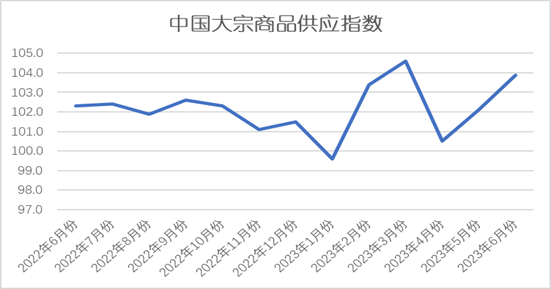 2023年6月份,大宗商品供應(yīng)指數(shù)兩連升至107.0%,較上月上升1.8個百分點(diǎn),顯示隨著國內(nèi)經(jīng)濟(jì)溫和復(fù)蘇,加之需求恢復(fù)以及生產(chǎn)利潤有所修復(fù),生產(chǎn)企業(yè)對后市預(yù)期良好,生產(chǎn)熱情高漲,國內(nèi)大宗商品市場供應(yīng)量持續(xù)增加,供應(yīng)壓力不斷加大。從各主要商品來看,本月煤炭供應(yīng)指數(shù)升至2020年8月份以來的最高,各類商品供應(yīng)量較上月均有所增加,其中鋼鐵供應(yīng)量時隔兩個月后再現(xiàn)增長態(tài)勢,且除成品油供應(yīng)量增速略有減緩?fù)猓溆嗥贩N均呈現(xiàn)增速加快的格局。