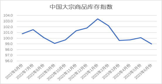 2023年6月份,大宗商品庫存指數(shù)為99.0%,指數(shù)在上月回升后,再度下跌,且跌至2021年6月份以來的最低,顯示由于近期國內(nèi)大宗商品市場供需兩旺,供求關(guān)系明顯改善,商品庫存持續(xù)減少,市場庫存壓力繼續(xù)緩解。各主要商品中,鋼鐵、鐵礦石庫存量繼續(xù)下降,有色金屬庫存量由升轉(zhuǎn)降,化工和汽車庫存量雖有增加,但增速有所放緩,煤炭和成品油受生產(chǎn)企業(yè)持續(xù)復(fù)產(chǎn)的影響,庫存量繼續(xù)增加,且增速繼續(xù)加快。