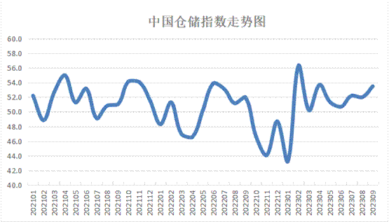 中國物流與采購聯合會和中儲發展股份有限公司聯合調查的中國倉儲指數,2023年9月份為53.5%,較上月上升1.5個百分點,連續八個月保持在擴張區間,本月升幅較為明顯,并達到近五個月內的高點,顯示倉儲行業保持較快發展水平。新訂單、業務量、設施利用率、業務利潤、期末庫存、業務活動預期等指數均有回升,表明倉儲業務需求增勢較好,企業盈利狀況有所改善,補庫積極性提高,對未來預期較為樂觀。具體來看,本月指數有以下幾個特點: