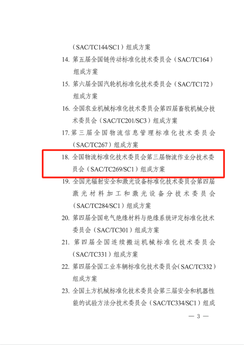 近日,國家標準化管理委員會發布公告(2023年第11號),批準全國物流標準化技術委員會物流作業分技術委員會第三屆組成方案。