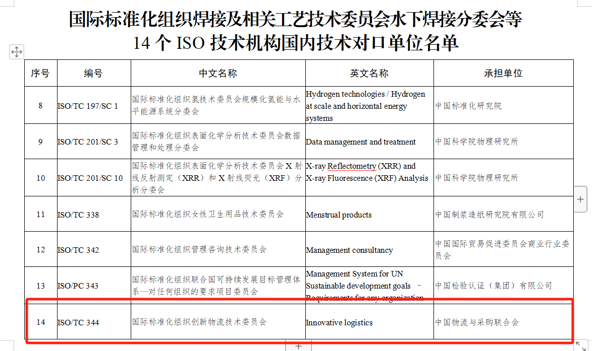 2023年12月18日,經國家標準化管理委員會批準,同意中國物流與采購聯合會(以下簡稱“中物聯”)承擔國際標準化組織ISO/TC344(創新物流技術委員會)的國內技術對口單位工作(見公告)。