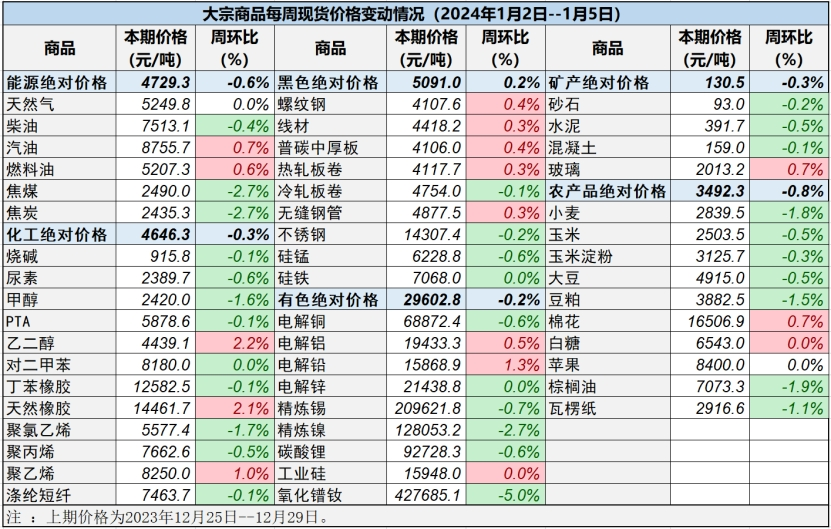 本表所示大宗商品價(jià)格(類別與產(chǎn)品規(guī)格說明見附表)為以人民幣計(jì)價(jià)的現(xiàn)貨價(jià)格(包含流通費(fèi)用、利潤和稅費(fèi)等)。計(jì)算這些價(jià)格時(shí)使用的信息來源,主要包括國內(nèi)重點(diǎn)地區(qū)的生產(chǎn)商、貿(mào)易商及下游消費(fèi)企業(yè)之間的成交、詢報(bào)盤及可成交價(jià)格。價(jià)格單位為人民幣元/噸。
