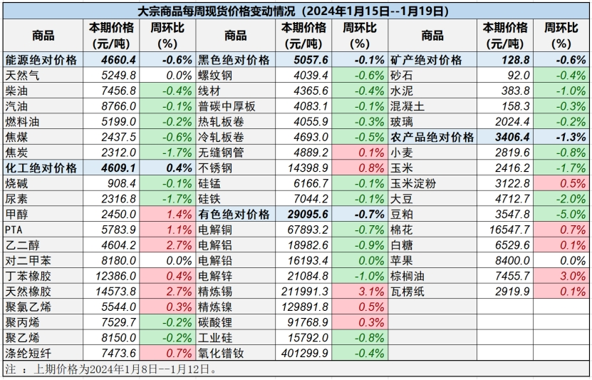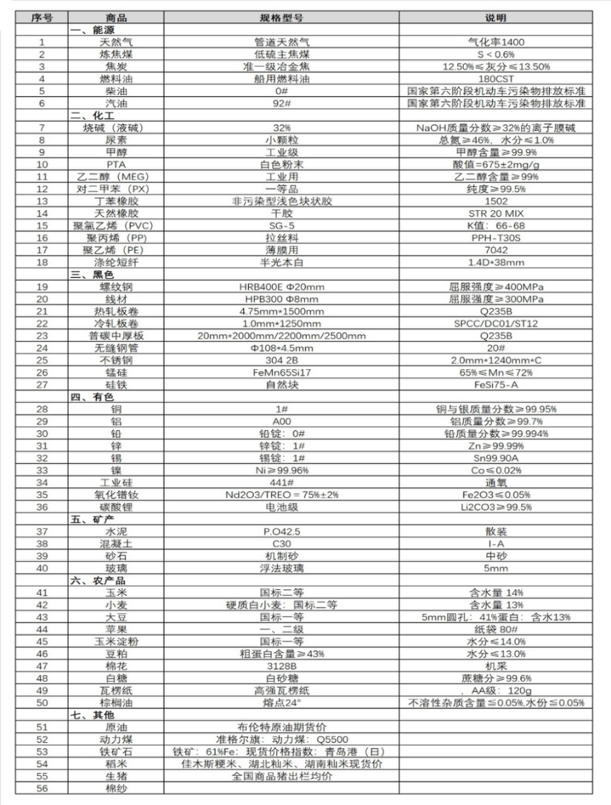 本表所示大宗商品價格(類別與產品規格說明見附表)為以人民幣計價的現貨價格(包含流通費用、利潤和稅費等)。計算這些價格時使用的信息來源,主要包括國內重點地區的生產商、貿易商及下游消費企業之間的成交、詢報盤及可成交價格。價格單位為人民幣元/噸。