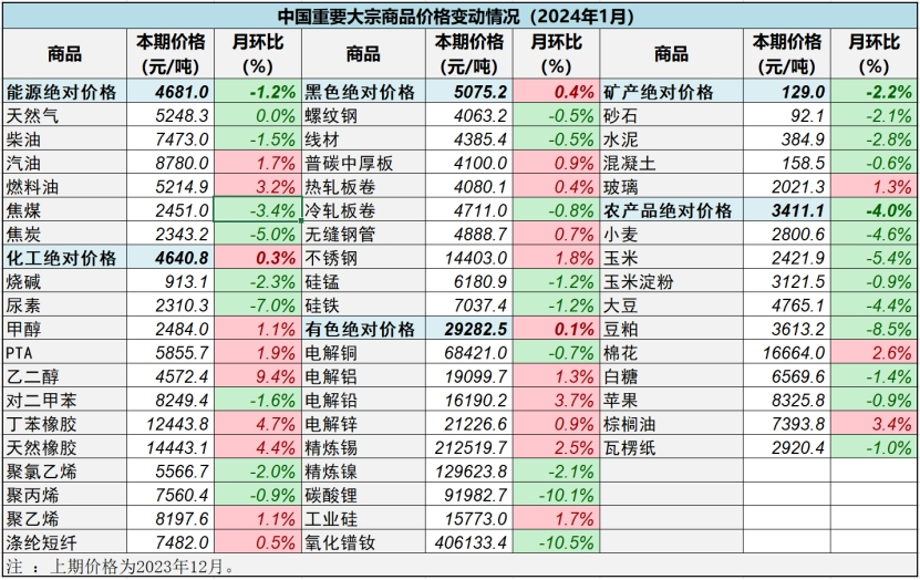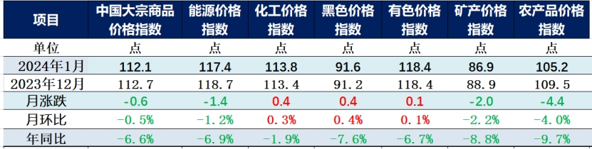 由中物聯大宗分會和上海鋼聯等單位聯合調查,中國物流與采購聯合會發布的2024年1月份中國大宗商品價格指數(CBPI)為112.1,環比小幅回落0.5%,同比下跌6.6%。從指數運行情況來看,臨近中國傳統春節假期,市場交投清淡,市場低位弱市運行,盡管受農產品價格下跌拖累,指數連續四月下跌,但跌幅逐漸收窄,顯示下行動力不足,特別是1月PMI指數小幅回升,也表明企業生產有恢復跡象,對后市我們仍保持原有觀點,預計市場價格下行空間有限。