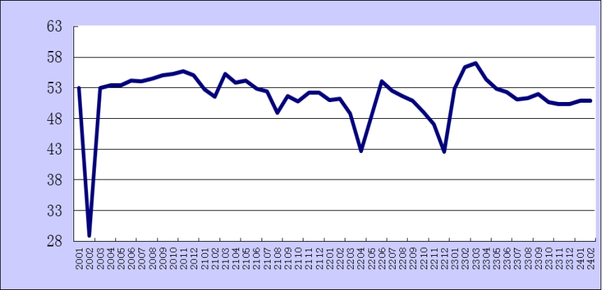 中國物流與采購聯合會、國家統計局服務業調查中心采購經理調查發布的2024年2月份綜合PMI產出指數為50.9%,較上月持平。該指數是PMI指標體系中反映當期全行業(制造業和非制造業)產出變化情況的綜合指數,由制造業生產指數與非制造業商務活動指數加權求和而成,權數分別為制造業和非制造業占GDP的比重。