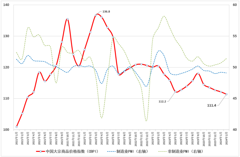 由中物聯(lián)大宗分會和上海鋼聯(lián)等單位聯(lián)合調(diào)查,中國物流與采購聯(lián)合會發(fā)布的2024年2月份中國大宗商品價格指數(shù)(CBPI)為111.4,環(huán)比小幅回落0.7%,同比下跌7.5%。從指數(shù)運行情況來看,受春節(jié)假期需求減弱因素影響,市場價格繼續(xù)維持低位運行態(tài)勢,但底部跡象明顯。隨兩會召開全年經(jīng)濟增長目標和經(jīng)濟政策逐步明朗,政府逆周期調(diào)節(jié)政策效果逐步顯現(xiàn),以及節(jié)后企業(yè)生產(chǎn)活動日趨活躍,預(yù)計市場價格下行空間有限、經(jīng)濟回升向好態(tài)勢將進一步鞏固。