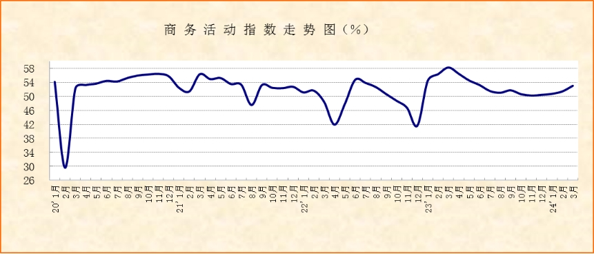 中國物流與采購聯合會、國家統計局服務業調查中心發布的2024年3月份中國非制造業商務活動指數為53%,較上月上升1.6個百分點,連續4個月上升,且升幅較上月繼續擴大,創出自去年7月以來的新高,顯示非制造業經營活動在前幾個月蓄勢盤整基礎上加快增長。結合細分數據變化來看,經濟相關活動加速啟動,新動能相關服務業保持活躍,融資環境繼續趨好,企業信心也有所增強。