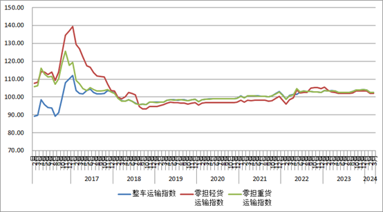 分車型指數(shù)看,各車型指數(shù)環(huán)比均有所回落,同比去年較快回落。以大宗商品及區(qū)域運輸為主的整車指數(shù)為102.6點,比上月回落0.08%,比上年同期回落0.9%。零擔(dān)指數(shù)中,零擔(dān)輕貨指數(shù)為102.1點,比上月回落0.02%,比上年同期回落0.76%;零擔(dān)重貨指數(shù)為102.5點,比上月回落0.12%,比上年同期回落0.99%。