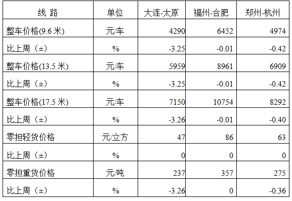 分車型看,各車型指數(shù)環(huán)比略微回落。其中,整車指數(shù)為1025.20點,比上周回落0.01%;零擔(dān)輕貨指數(shù)為1020.74點,比上周回落0.01%;零擔(dān)重貨指數(shù)為1024.02點,與上周基本持平。