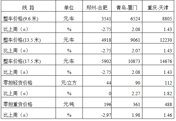 表1 本周部分線路平均價格及環比情況對比