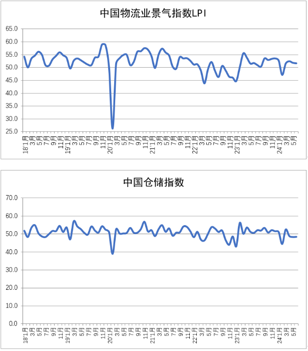 中國物流與采購聯合會發布的2024年6月份中國物流業景氣指數為51.6%,較上月回落0.2個百分點;中國倉儲指數為48.5%,較上月回升0.1個百分點。