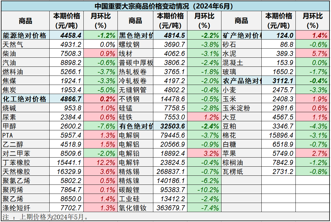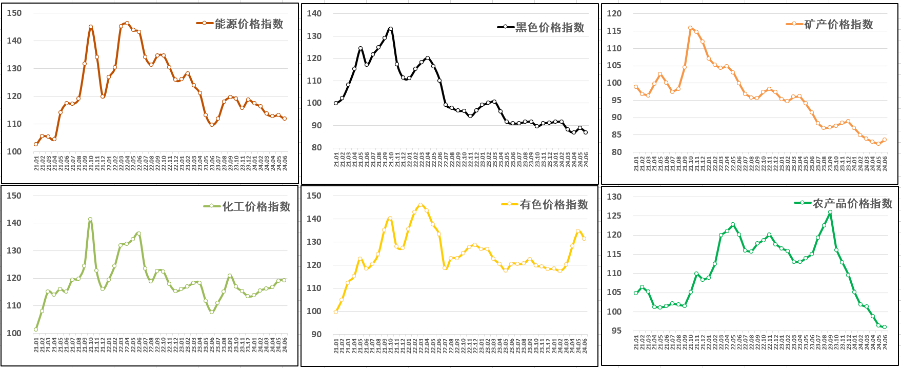 分行業看:有色、黑色、能源和農產品指數下跌,礦產品、化工價格指數環比上漲。其中,有色價格指數自高點回落,報131.4點,月環比下跌2.4%,年同比上漲9%;黑色價格指數小幅下行,報86.9點,月環比下跌2.2%,年同比下跌4.4%;能源價格指數再度下探,創近11個月以來低點,報111.8點,月環比下跌1.2%,年同比上漲1.9%;農產品價格指數延續跌勢,但跌幅收窄,報95.9點,月環比下跌0.4%,年同比下跌16.6%;化工價格指數再創年內新高,但漲幅收窄,報119.3點,月環比上漲0.2%,年同比上漲10.8%;礦產價格指數自低點反彈,報83.6點,月環比上漲1.4%,年同比下跌8.7%。