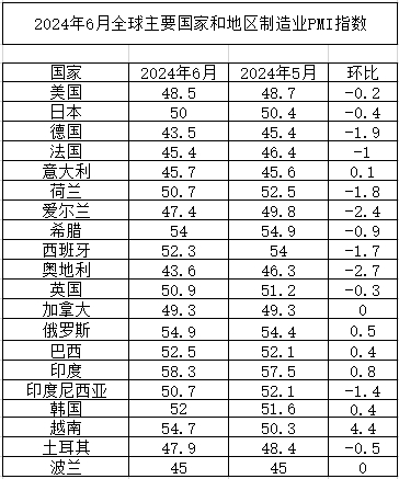 2024年6月份全球主要國家制造業PMI
