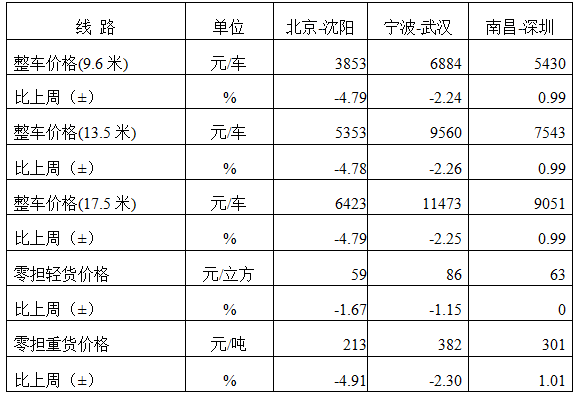 分車型看,各車型指數環比小幅回落。其中,整車指數為1029.45點,比上周回落1.22%;零擔輕貨指數為1014.48點,比上周回落1.26%;零擔重貨指數為1029.10點,比上周回落1.22%。