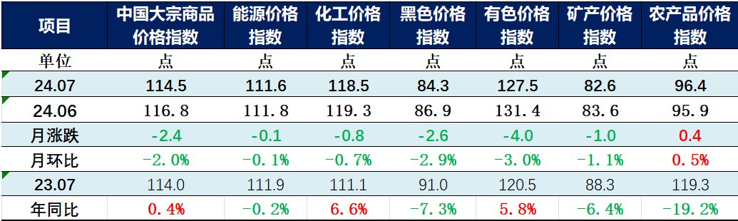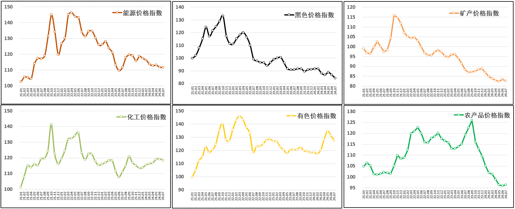 分行業(yè)看:有色、黑色、礦產(chǎn)、化工和能源價(jià)格指數(shù)下跌,農(nóng)產(chǎn)品價(jià)格指數(shù)環(huán)比上漲。其中,有色價(jià)格指數(shù)連續(xù)兩月下跌,報(bào)127.5點(diǎn),月環(huán)比下跌3%,年同比上漲5.8%;黑色價(jià)格指數(shù)繼續(xù)走低,報(bào)84.3點(diǎn),月環(huán)比下跌2.9%,年同比下跌7.3%;礦產(chǎn)價(jià)格指數(shù)整蕩走低,報(bào)82.6點(diǎn),月環(huán)比下跌1.1%,年同比下跌6.4%;化工價(jià)格指數(shù)自高點(diǎn)回落,報(bào)118.5點(diǎn),月環(huán)比下跌0.7%,年同比上漲6.6%;能源價(jià)格指數(shù)跌幅收窄,報(bào)111.6點(diǎn),月環(huán)比下跌0.1%,年同比下跌0.2%;農(nóng)產(chǎn)品價(jià)格指數(shù)止跌反彈,結(jié)束近十個(gè)月跌勢(shì),報(bào)96.4點(diǎn),月環(huán)比上漲0.5%,年同比下跌19.2%。