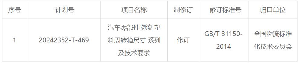 2024年7月30日,國家標準化管理委員會發布《關于下達2024年第五批推薦性國家批準計劃及相關標準外文版計劃的通知》(國標委發〔2024〕32號),其中下達了1項物流國家標準項目計劃。