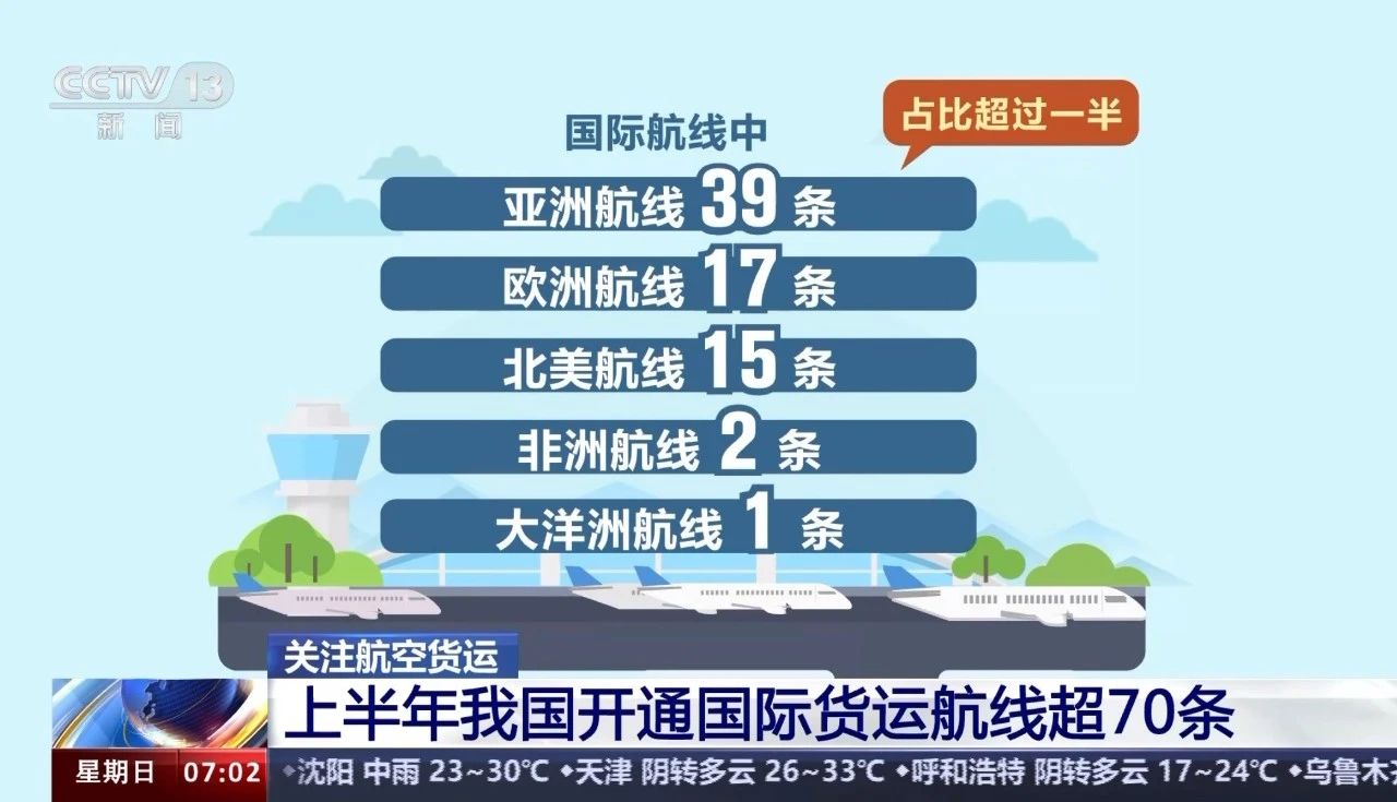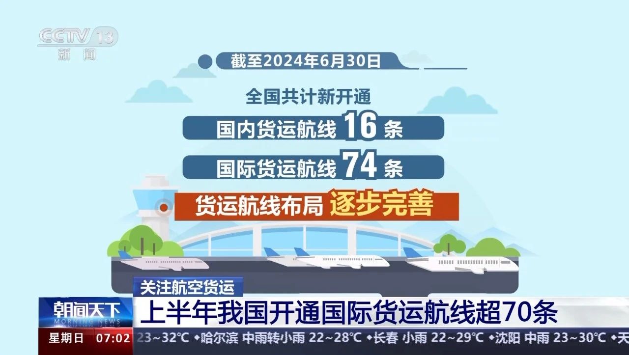 在航空物流需求上漲的背景下,我國貨運航線網絡不斷密織。據中國物流與采購聯合會航空物流分會統計,截至2024年6月30日,全國共計新開通國內貨運航線16條,國際貨運航線74條,貨運航線布局逐步完善。
