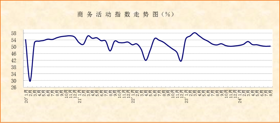 總體來看,非制造業經營活動延續擴張態勢,需求降幅有所收窄,投資與消費相關活動均有良好表現。在此背景下,企業預期繼續保持樂觀。8月份,非制造業業務活動預期雖較上月下降0.8個百分點,但仍保持在55%以上。建筑業和服務業業務活動預期指均在55%左右。