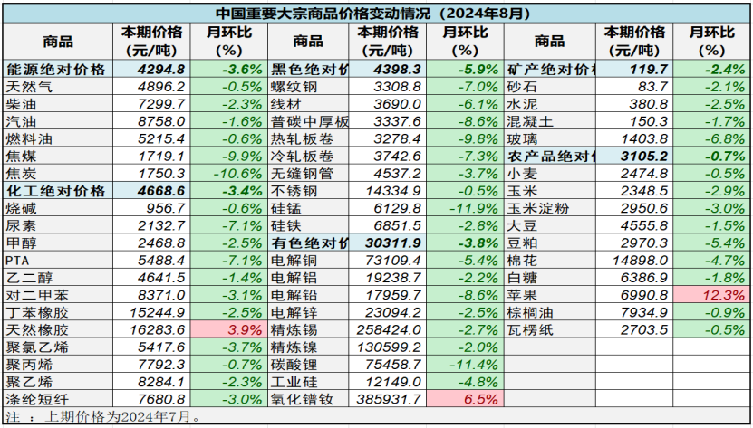 分商品看:在中國物流與采購聯(lián)合會重點(diǎn)監(jiān)測的50種大宗商品中,本月價(jià)格與上月相比,47種(94%)大宗商品價(jià)格下跌,3種(6%)大宗商品價(jià)格上漲。其中,漲幅前三的為蘋果、氧化鐠釹和天然橡膠,月環(huán)比分別上漲12.3%、6.5%和3.9%;跌幅前三的大宗商品為硅錳、碳酸鋰和焦炭,月環(huán)比分別下跌11.9%、11.4%和10.6%。