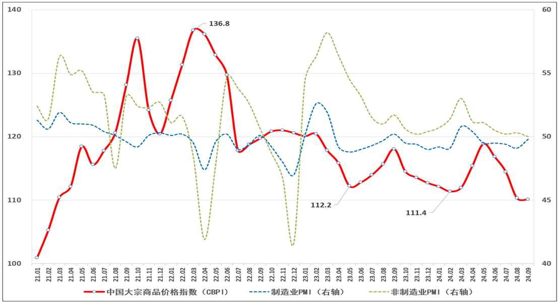 由中物聯大宗分會和上海鋼聯等單位聯合調查,中國物流與采購聯合會發布的2024年9月份中國大宗商品價格指數(CBPI)為110.1點,環比小幅回落0.2%,同比下跌6.7%。從指數運行情況來看,9月份CBPI受市場需求回暖、央行降息降準等影響,多數大宗商品價格自低位反彈,指數跌幅較上月大幅縮窄3.4個百分點。四季度預計隨企業生產經營活動回升,市場信心增強,以及貨幣和財政政策逆周期調節力度加大,經濟回穩向好基礎有望進一步鞏固。從國內外大宗商品指數走勢來看,全球貨幣政策從緊縮周期轉向寬松周期,將有利于擴大市場需求,促進企業投資,并對大宗商品價格形成支撐。