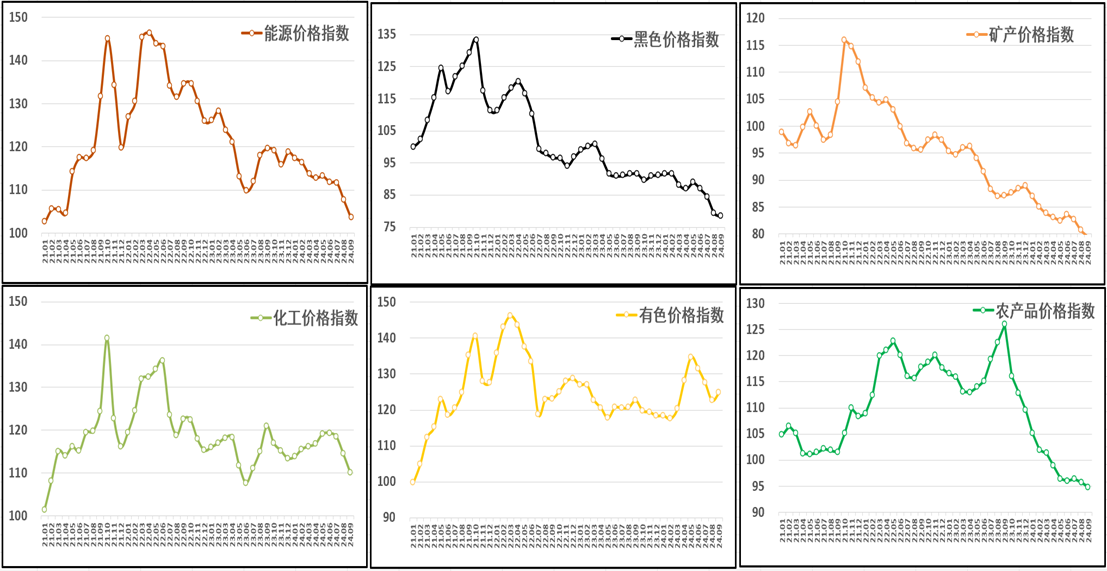 分行業看:有色價格指數止跌回升,報124.7點,月環比上漲1.8%,年同比上漲1.7%;農產品價格指數小幅回落,報94.8點,月環比下跌1%,年同比下跌24.8%;黑色價格指數跌幅縮窄,報78.4點,月環比下跌1.2%,年同比下跌14.4%;礦產價格指數再度走低,報79.5點,月環比下跌1.4%,年同比下跌8.8%;能源價格指數繼續下跌,報103.6點,月環比下跌3.8%,年同比下跌13.4%;化工價格指數跌幅擴大,報110點,月環比下跌3.9%,年同比下跌9%。