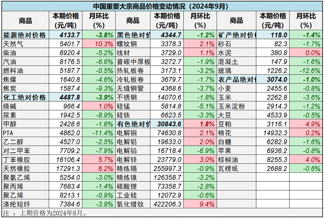 分商品看:在中國物流與采購聯合會重點監測的50種大宗商品中,本月價格與上月相比,14種(28%)大宗商品價格上漲,36種(72%)大宗商品價格下跌;截至9月30日,有42種大宗商品價格高于月內低位。本月漲幅前三的大宗商品為天然氣、氧化鐠釹和天然橡膠,月環比分別上漲10.3%、9.4%和6.2%;跌幅前三的為玻璃、PTA和焦炭,月環比分別下跌12.6%、11.4%和9.3%。