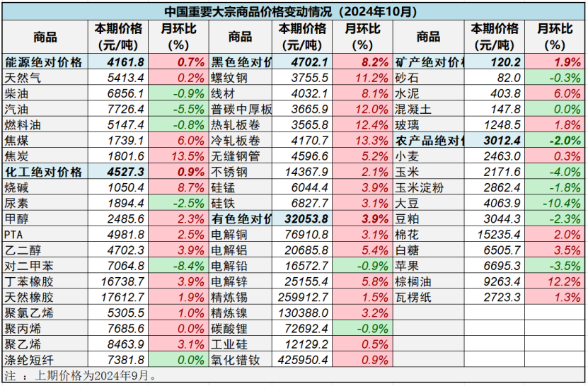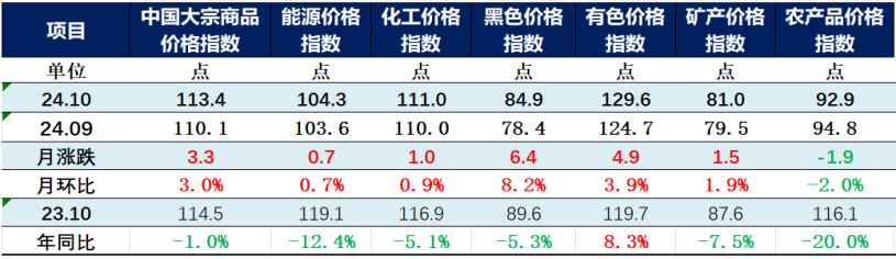 由中物聯(lián)大宗分會和上海鋼聯(lián)等單位聯(lián)合調(diào)查,中國物流與采購聯(lián)合會發(fā)布的2024年10月份中國大宗商品價格指數(shù)(CBPI)為113.4點(diǎn),環(huán)比上漲3%,同比下跌1%。從指數(shù)運(yùn)行情況來看,10月份CBPI受市場供需改善、企業(yè)生產(chǎn)活動加快,以及國家一攬子增量政策推出,多數(shù)大宗商品價格較上月上漲,環(huán)比大幅回升3個百分點(diǎn)。從國內(nèi)外大宗商品指數(shù)走勢來看,隨著全球通脹壓力逐步緩解,世界經(jīng)濟(jì)溫和復(fù)蘇、以及更為寬松的貨幣政策,經(jīng)濟(jì)恢復(fù)向上動能正在積聚,短期內(nèi)大宗商品價格或仍有上行空間。四季度預(yù)計隨市場需求繼續(xù)恢復(fù),大宗市場活力增強(qiáng),以及各項(xiàng)政策的加快落實(shí)和協(xié)調(diào)推進(jìn)、經(jīng)濟(jì)穩(wěn)中向好態(tài)勢有望進(jìn)一步延續(xù)。