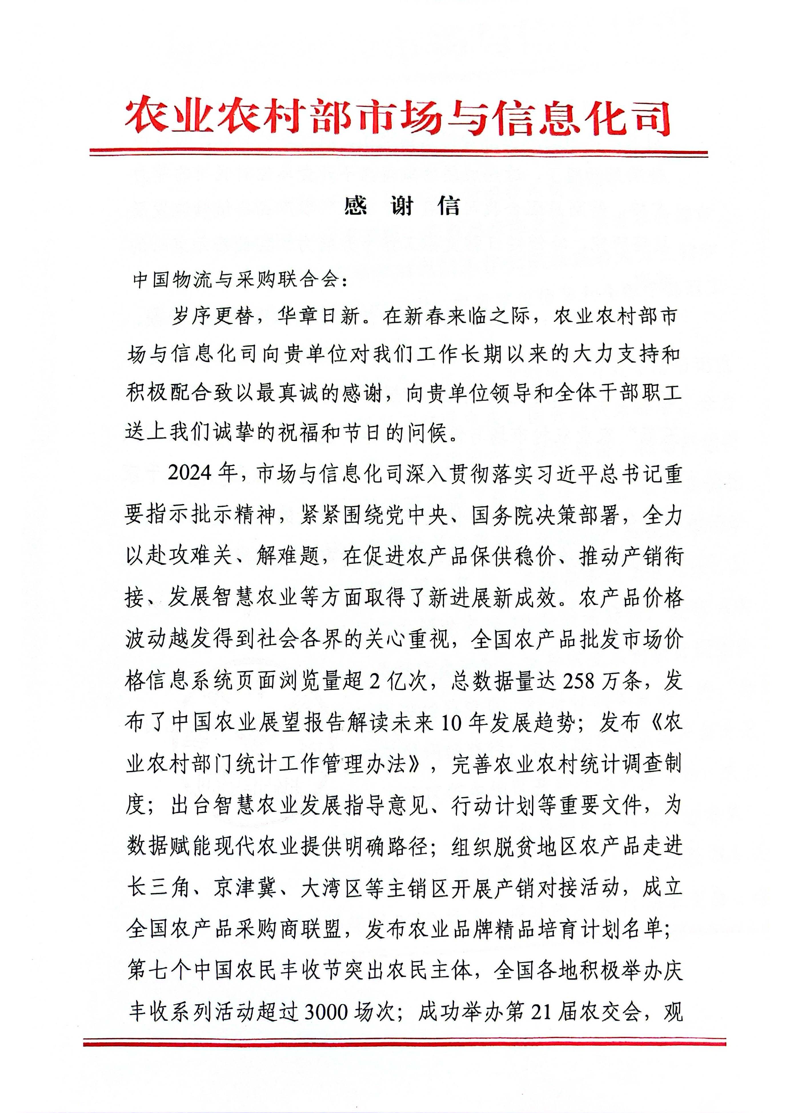 農業農村部市場與信息化司致信感謝中物聯