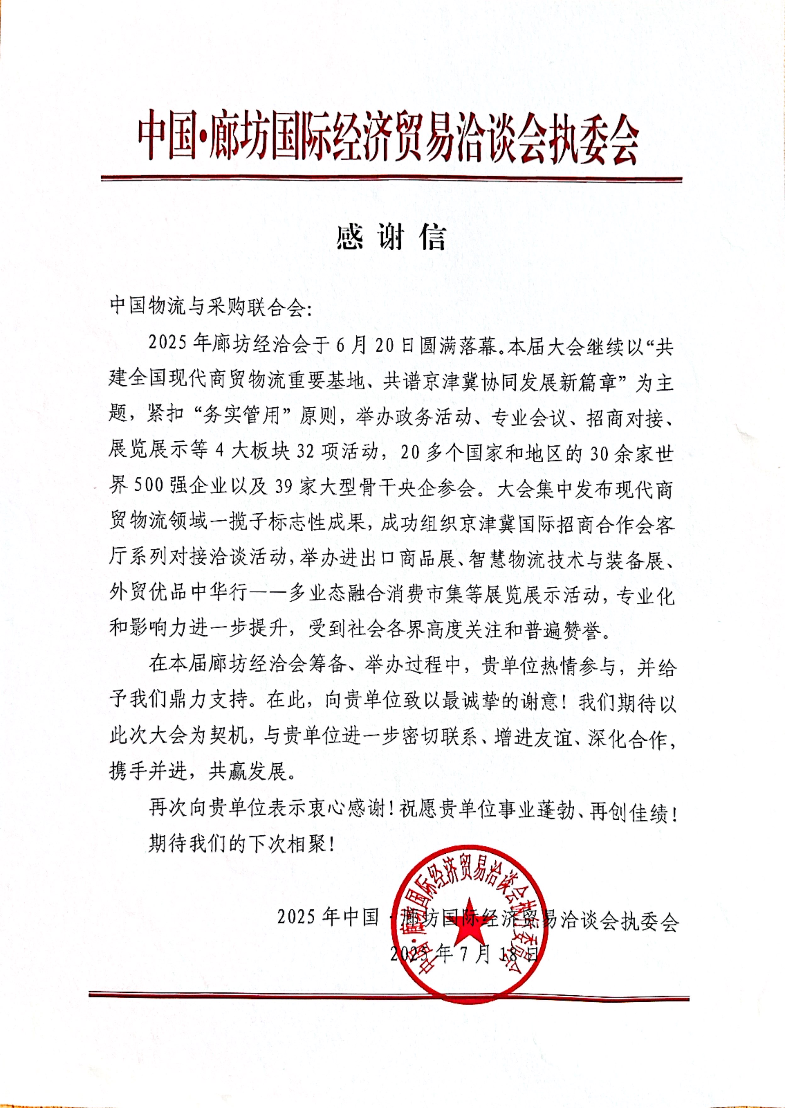 中國·廊坊國際經(jīng)濟貿(mào)易洽談會執(zhí)委會致中物聯(lián)感謝信