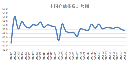 中國物流與采購聯合會和中儲發展股份有限公司聯合調查的中國倉儲指數,2025年8月份為49.3%,較上月回落0.8個百分點,連續九個月運行在擴張區間后落入50%以下,顯示行業運行有所波動。分項指數變化顯示,受高溫多雨天氣與部分大宗商品市場淡季影響,倉儲業務需求相對低迷,商品周轉速度減慢,庫存水平保持平穩。業務活動預期指數在擴張區間繼續上升,反映企業對后市信心充足。具體來看,本月指數呈現以下特征: