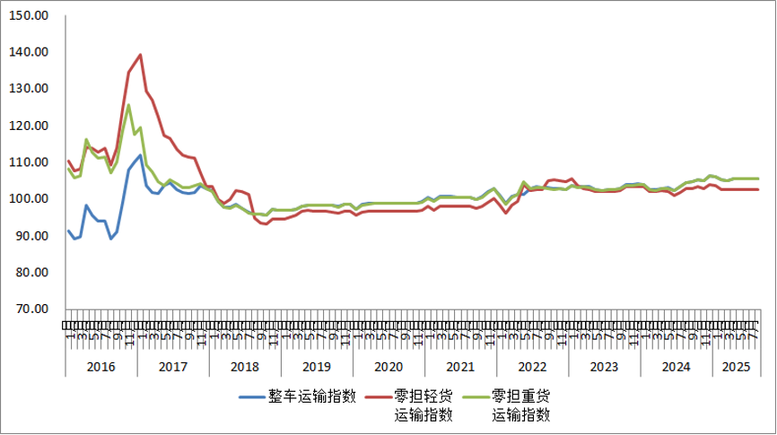 分車型指數看,各車型指數環比總體平穩,同比去年走勢分化。以大宗商品及區域運輸為主的整車指數為105.6點,比上月回升0.01%,比上年同期回升1%。零擔指數中,零擔輕貨指數為102.6點,與上月基本持平,比上年同期回落0.3%;零擔重貨指數為105.6點,與上月基本持平,比上年同期回升1.1%。