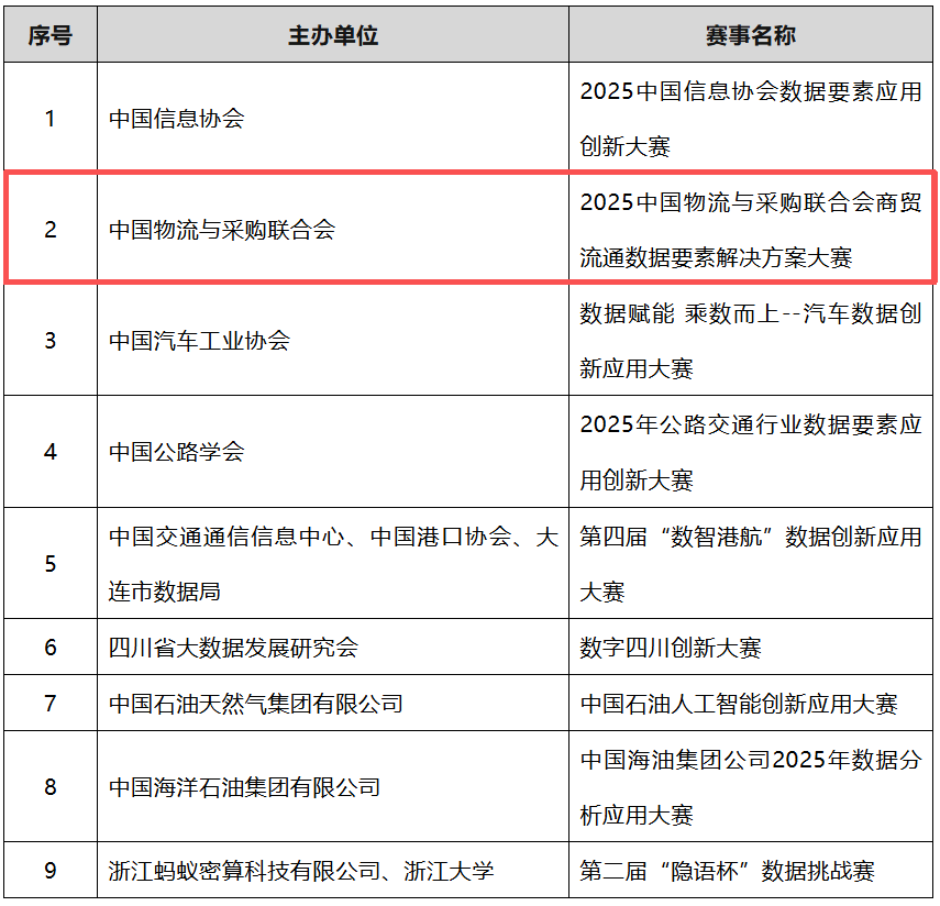 2025年9月24日,國家數(shù)據(jù)局發(fā)布《關(guān)于2025年“數(shù)據(jù)要素×”大賽全國總決賽推薦資格審核結(jié)果的公告》,中國物流與采購聯(lián)合會舉辦的“2025中國物流與采購聯(lián)合會商貿(mào)流通數(shù)據(jù)要素解決方案大賽”通過國家數(shù)據(jù)局的審核,成為具備“2025年‘?dāng)?shù)據(jù)要素×’大賽”全國總決賽推薦資格的第三方賽事。