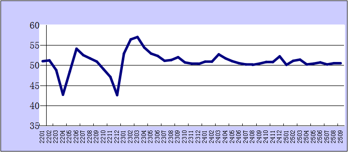 2022年1月-2025年9月綜合PMI產出指數走勢圖