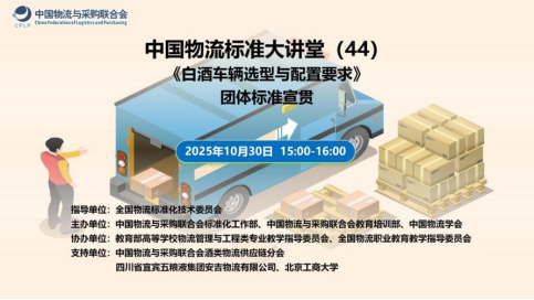 2025年10月30日,在全國物流標準化技術委員會的指導下,中國物流與采購聯合會標準化工作部和教育培訓部、中國物流學會共同主辦了“中國物流標準大講堂”第44期——《白酒車輛選型與配置要求》(T/CFLP 0081—2025)團體標準宣貫活動。960余人次在線參加活動。