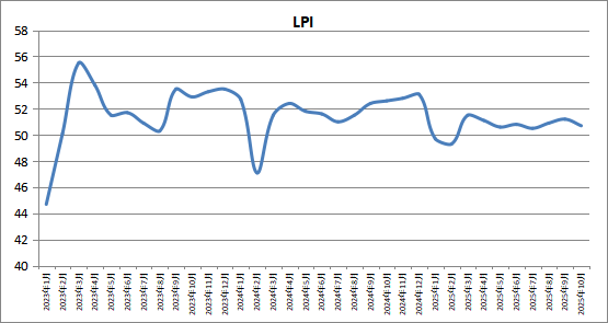 中國物流與采購聯合會發布的2025年10月份中國物流業景氣指數為50.7%,環比回落0.5個百分點。在前期需求充分釋放基礎上,10月份物流業景氣指數有所回落,但仍保持擴張態勢,其中業務總量指數、新訂單指數、資金周轉率指數、物流服務價格指數、固定資產投資完成額指數、從業人員指數和業務活動預期指數處在景氣區間。