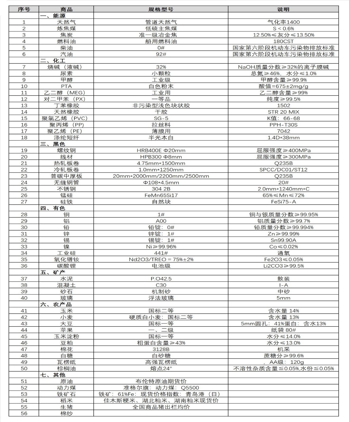 本表所示大宗商品價(jià)格(類別與產(chǎn)品規(guī)格說明見附表)為以人民幣計(jì)價(jià)的現(xiàn)貨價(jià)格(包含流通費(fèi)用、利潤和稅費(fèi)等)。計(jì)算這些價(jià)格時(shí)使用的信息來源,主要包括國內(nèi)重點(diǎn)地區(qū)的生產(chǎn)商、貿(mào)易商及下游消費(fèi)企業(yè)之間的成交、詢報(bào)盤及可成交價(jià)格。價(jià)格單位為人民幣元/噸。