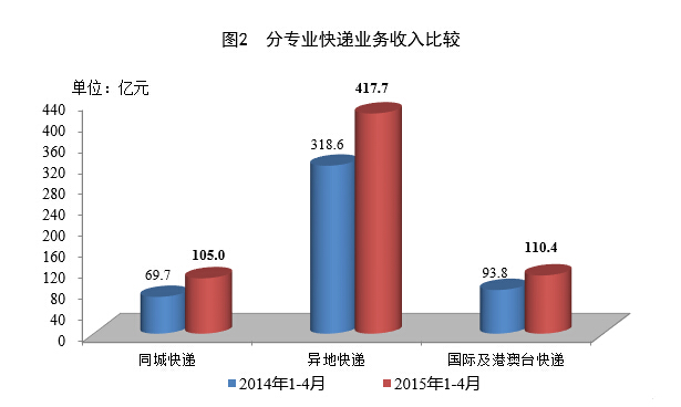 1-4月,同城、異地、國(guó)際及港澳臺(tái)快遞業(yè)務(wù)收入分別占全部快遞收入的13.9%、55.3%和14.6%;業(yè)務(wù)量分別占全部快遞業(yè)務(wù)量的26.4%、71.4%和2.2%。與去年同期相比,同城快遞業(yè)務(wù)收入的比重上升1.7個(gè)百分點(diǎn),異地快遞業(yè)務(wù)收入的比重下降0.6個(gè)百分點(diǎn),國(guó)際及港澳臺(tái)業(yè)務(wù)收入的比重下降了1.9個(gè)百分點(diǎn)。