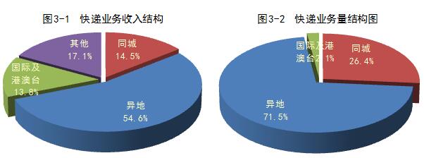 1-10月,同城、異地、國際及港澳臺(tái)快遞業(yè)務(wù)收入分別占全部快遞收入的14.5%、54.6%和13.8%;業(yè)務(wù)量分別占全部快遞業(yè)務(wù)量的26.4%、71.5%和2.1%。與去年同期相比,同城快遞業(yè)務(wù)收入的比重上升1.8個(gè)百分點(diǎn),異地快遞業(yè)務(wù)收入的比重下降0.6個(gè)百分點(diǎn),國際及港澳臺(tái)業(yè)務(wù)收入的比重下降了2.1個(gè)百分點(diǎn)。
