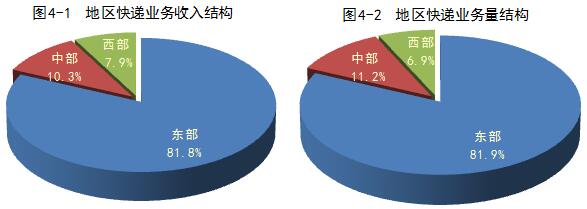 1-10月,東、中、西部地區(qū)快遞業(yè)務(wù)收入的比重分別為81.8%、10.3%和7.9%,業(yè)務(wù)量比重分別為81.9%、11.2%和6.9%。與去年同期相比,東部地區(qū)快遞業(yè)務(wù)收入比重下降了1.1個(gè)百分點(diǎn),快遞業(yè)務(wù)量比重持平;中部地區(qū)快遞業(yè)務(wù)收入比重上升了0.9個(gè)百分點(diǎn),快遞業(yè)務(wù)量比重上升了0.5個(gè)百分點(diǎn);西部地區(qū)快遞業(yè)務(wù)收入比重上升了0.2個(gè)百分點(diǎn),快遞業(yè)務(wù)量比重下降了0.5個(gè)百分點(diǎn)。