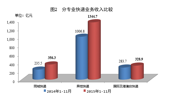 1-11月,同城、異地、國際及港澳臺快遞業務收入分別占全部快遞收入的14.5%、54.7%和13.4%;業務量分別占全部快遞業務量的26.2%、71.7%和2.1%。與去年同期相比,同城快遞業務收入的比重上升1.6個百分點,異地快遞業務收入的比重下降0.6個百分點,國際及港澳臺業務收入的比重下降了2.2個百分點。