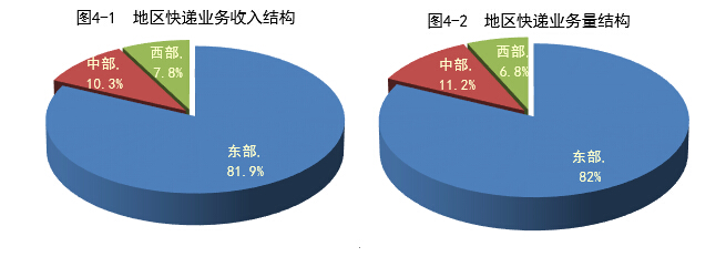 1-11月,東、中、西部地區快遞業務收入的比重分別為81.9%、10.3%和7.8%,業務量比重分別為82%、11.2%和6.8%。與去年同期相比,東部地區快遞業務收入比重下降了1.1個百分點,快遞業務量比重下降了0.2個百分點;中部地區快遞業務收入比重上升了1個百分點,快遞業務量比重上升了0.6個百分點;西部地區快遞業務收入比重上升了0.1個百分點,快遞業務量比重下降了0.4個百分點。