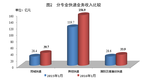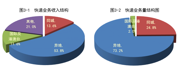 1月,同城、異地、國際及港澳臺快遞業(yè)務(wù)收入分別占全部快遞收入的13.6%、53.8%和11.6%;業(yè)務(wù)量分別占全部快遞業(yè)務(wù)量的24.8%、73.2%和2.0%。與去年同期相比,同城快遞業(yè)務(wù)收入的比重上升0.2個百分點(diǎn),異地快遞業(yè)務(wù)收入的比重下降2.9個百分點(diǎn),國際及港澳臺業(yè)務(wù)收入的比重下降了2個百分點(diǎn)。