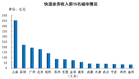 快遞業務收入排名前十五位的城市依次是上海、深圳、廣州、北京、杭州、蘇州、東莞、金華(義烏)、南京、成都、天津、武漢、寧波、鄭州、溫州,其快遞業務收入合計占全部快遞業務收入的比重達到63.4%。