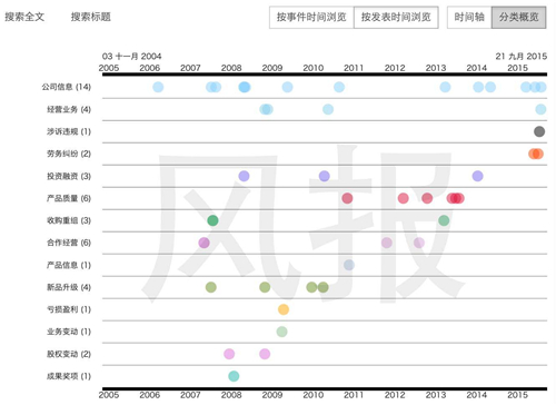 “風報”系統(tǒng)包含歷年的全網(wǎng)重大事件數(shù)據(jù),作為一個龐大的情報庫,可以展現(xiàn)企業(yè)的歷史事件,并跟蹤現(xiàn)有的事件動向。通過開創(chuàng)性的企業(yè)事件挖掘模型,自動判別每件事件的性質,進行分類處理,并通過時間軸展示事件類型與密度分布,揭示事實真相,發(fā)現(xiàn)企業(yè)情報信息。